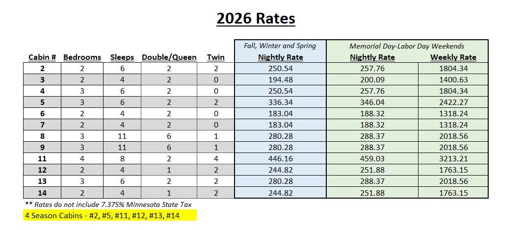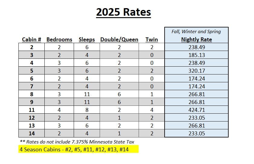 Pets will be allowed for the 2025 & 2026 season. There is a $150 (check) refundable pet deposit required at check-in, that will be returned at check-out once the cabin has been checked. Bring an extra check for the pet deposit; we'll hold it until after check-out and return to you if there is no sign the pet was in the cabin. There is a two-dog max allowance per cabin.